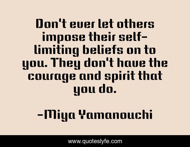 This page presents the quote "Don't ever let others impose their self-limiting beliefs on to you. They don't have the courage and spirit that you do.". Author of this quote is Miya Yamanouchi. This quote is about faith, inspiring, self-belief, self-confidence, positive, motivational, confidence, courage, optimistic,.