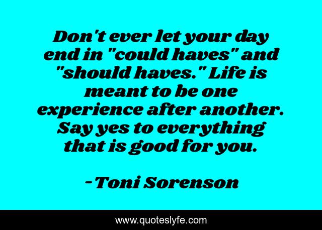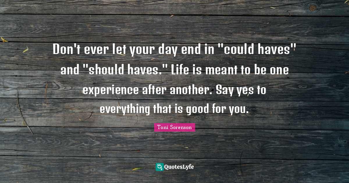 This page presents the quote "Don't ever let your day end in "could haves" and "should haves." Life is meant to be one experience after another. Say yes to everything that is good for you.". Author of this quote is Toni Sorenson. This quote is about thinking, brain, life, motivation, experience,.