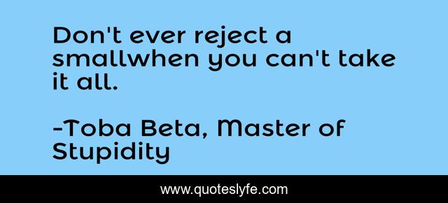 This page presents the quote "Don't ever reject a smallwhen you can't take it all.". Author of this quote is Toba Beta, Master of Stupidity. This quote is about small, winner-takes-it-all, worth,.