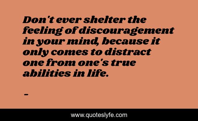 This page presents the quote "Don't ever shelter the feeling of discouragement in your mind, because it only comes to distract one from one's true abilities in life.". Author of this quote is . This quote is about don-t-get-discouraged, discourage, ability, edmond-mbiaka, one-s-true-abilities-in-life, the-feeling-of-discouragement, discouraging, failure, mistakes,.