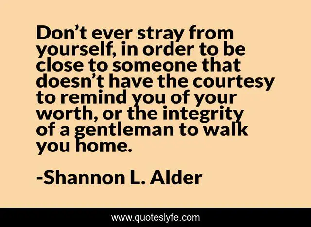 This page presents the quote "Don’t ever stray from yourself, in order to be close to someone that doesn’t have the courtesy to remind you of your worth, or the integrity of a gentleman to walk you home.". Author of this quote is Shannon L. Alder. This quote is about self-respect, love, manners, feelings, lift-others, home, choices, integrity, relationships,.