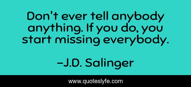 This page presents the quote "Don't ever tell anybody anything. If you do, you start missing everybody.". Author of this quote is J.D. Salinger. This quote is about salinger, stories,.