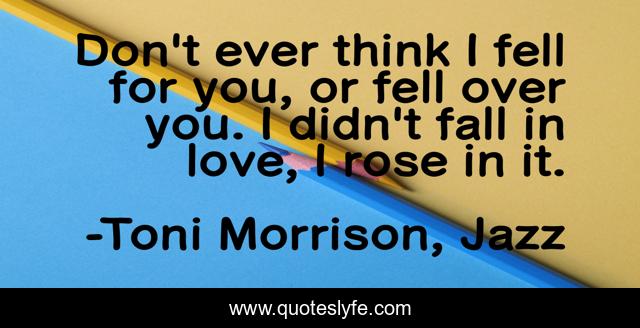 This page presents the quote "Don't ever think I fell for you, or fell over you. I didn't fall in love, I rose in it.". Author of this quote is Toni Morrison, Jazz. This quote is about love, affection,.