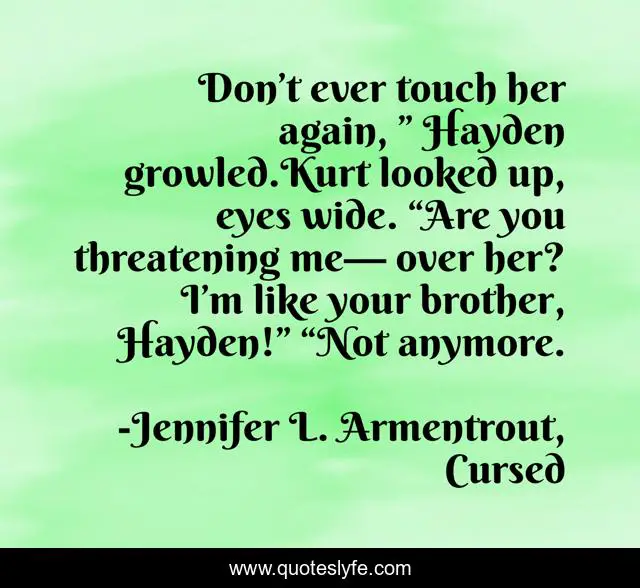 This page presents the quote "Don’t ever touch her again, ” Hayden growled.Kurt looked up, eyes wide. “Are you threatening me— over her? I’m like your brother, Hayden!” “Not anymore.". Author of this quote is Jennifer L. Armentrout, Cursed. .