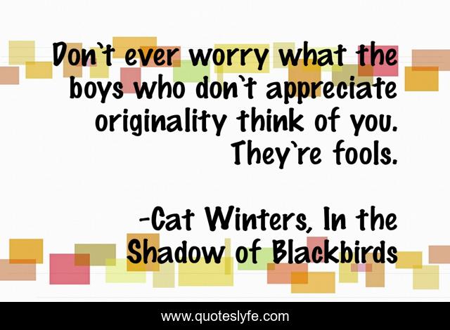 This page presents the quote "Don’t ever worry what the boys who don’t appreciate originality think of you. They’re fools.". Author of this quote is Cat Winters, In the Shadow of Blackbirds. .
