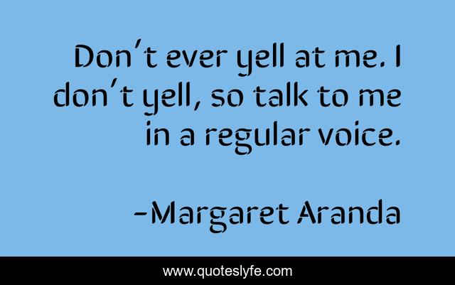 This page presents the quote "Don’t ever yell at me. I don’t yell, so talk to me in a regular voice.". Author of this quote is Margaret Aranda. This quote is about yell, dr-margaret-aranda, author,.