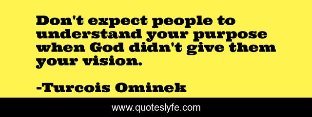 This page presents the quote "Don't expect people to understand your purpose when God didn't give them your vision.". Author of this quote is Turcois Ominek. This quote is about truth, goals, god, religion, purpose, inspirational, enthusiasm, vision, inspiration,.