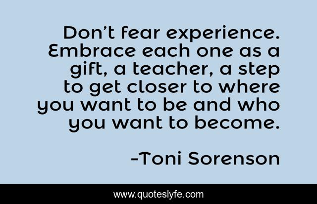This page presents the quote "Don’t fear experience. Embrace each one as a gift, a teacher, a step to get closer to where you want to be and who you want to become.". Author of this quote is Toni Sorenson. This quote is about fear, life, experience, goals,.