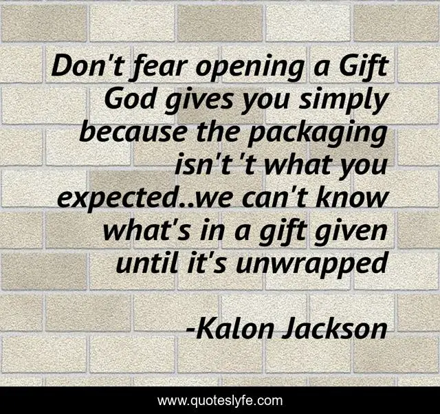 This page presents the quote "Don't fear opening a Gift God gives you simply because the packaging isn't 't what you expected..we can't know what's in a gift given until it's unwrapped". Author of this quote is Kalon Jackson. .