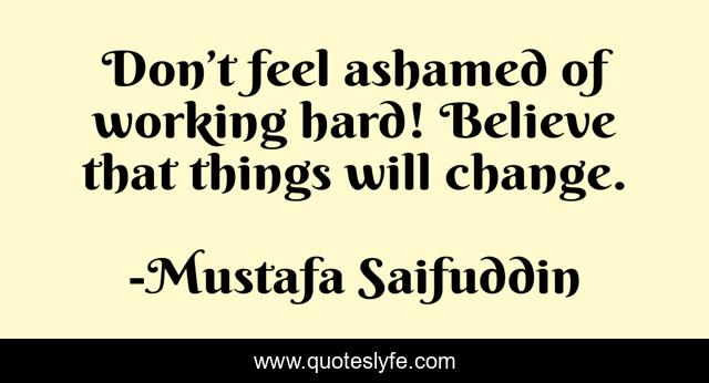 This page presents the quote "Don’t feel ashamed of working hard! Believe that things will change.". Author of this quote is Mustafa Saifuddin. This quote is about work-hard, hard-work, believe-and-achieve, work, hardwork, believe-in-yourself, believe,.