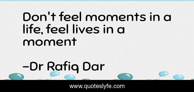 This page presents the quote "Don't feel moments in a life, feel lives in a moment". Author of this quote is Dr Rafiq Dar. This quote is about moments, life,.