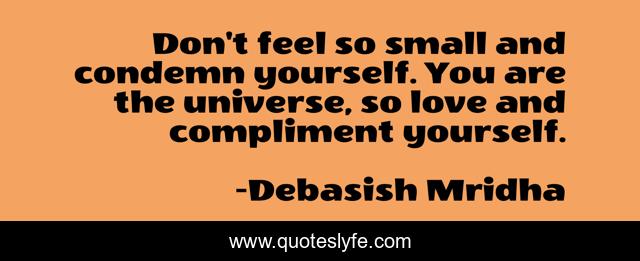 This page presents the quote "Don't feel so small and condemn yourself. You are the universe, so love and compliment yourself.". Author of this quote is Debasish Mridha. This quote is about life, love, knowledge, inspirational, intelligence, philosophy, wisdom, quotes, affection,.