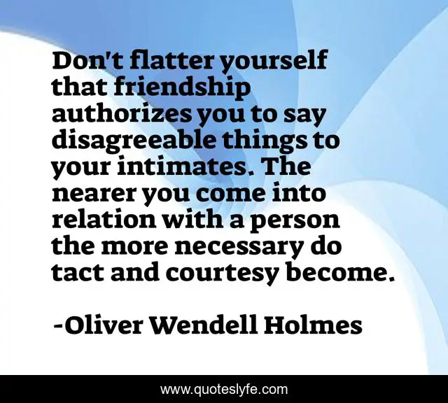This page presents the quote "Don't flatter yourself that friendship authorizes you to say disagreeable things to your intimates. The nearer you come into relation with a person the more necessary do tact and courtesy become.". Author of this quote is Oliver Wendell Holmes. .