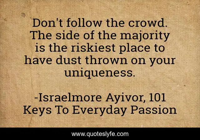 This page presents the quote "Don't follow the crowd. The side of the majority is the riskiest place to have dust thrown on your uniqueness.". Author of this quote is Israelmore Ayivor, 101 Keys To Everyday Passion. This quote is about food-for-thought, be-you, risk, crowd, be-yourself, major, majority, uniqueness, passion,.