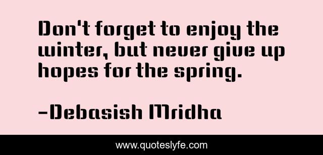 This page presents the quote "Don't forget to enjoy the winter, but never give up hopes for the spring.". Author of this quote is Debasish Mridha. This quote is about hope-for-spring, winter, spring, philosophy, debasish-mridha, quotes, enjoy-winter, inspirational, enthusiasm,.