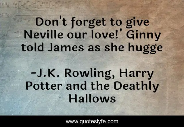 This page presents the quote "Don't forget to give Neville our love!' Ginny told James as she hugge". Author of this quote is J.K. Rowling, Harry Potter and the Deathly Hallows. This quote is about jk-rowling, neville, humor, harry-potter, professor, later, nineteen-years-later, school, deathly-hallows,.