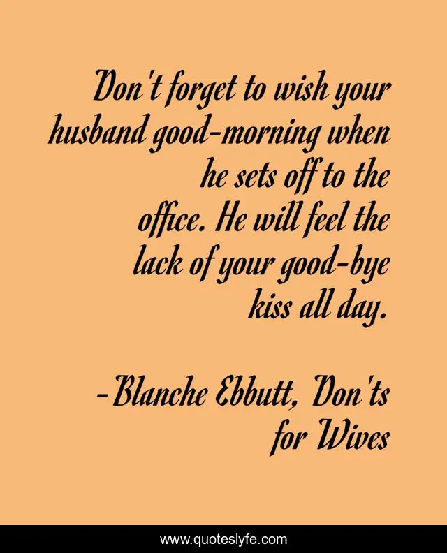 This page presents the quote "Don't forget to wish your husband good-morning when he sets off to the office. He will feel the lack of your good-bye kiss all day.". Author of this quote is Blanche Ebbutt, Don'ts for Wives. .