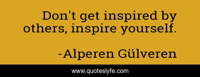 This page presents the quote "Don't get inspired by others, inspire yourself.". Author of this quote is Alperen Gülveren. This quote is about motivation, self-confidence, yourself, inspirational, others, aristocrat, enthusiasm, aristocrat38, inspiration,.