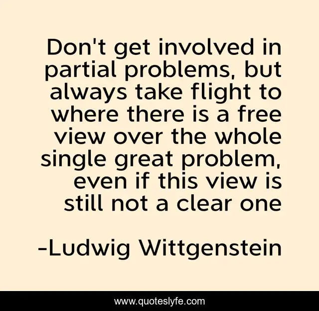 This page presents the quote "Don't get involved in partial problems, but always take flight to where there is a free view over the whole single great problem, even if this view is still not a clear one". Author of this quote is Ludwig Wittgenstein. This quote is about philosophy, logic,.