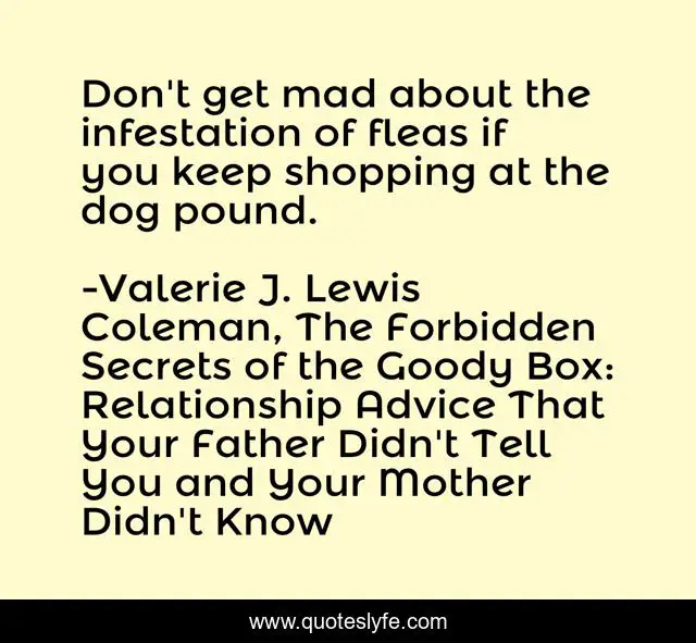 This page presents the quote "Don't get mad about the infestation of fleas if you keep shopping at the dog pound.". Author of this quote is Valerie J. Lewis Coleman, The Forbidden Secrets of the Goody Box: Relationship Advice That Your Father Didn't Tell You and Your Mother Didn't Know. This quote is about relationships, humor, chick-lit, men, romance, marriage, inspirational, enthusiasm, dating,.
