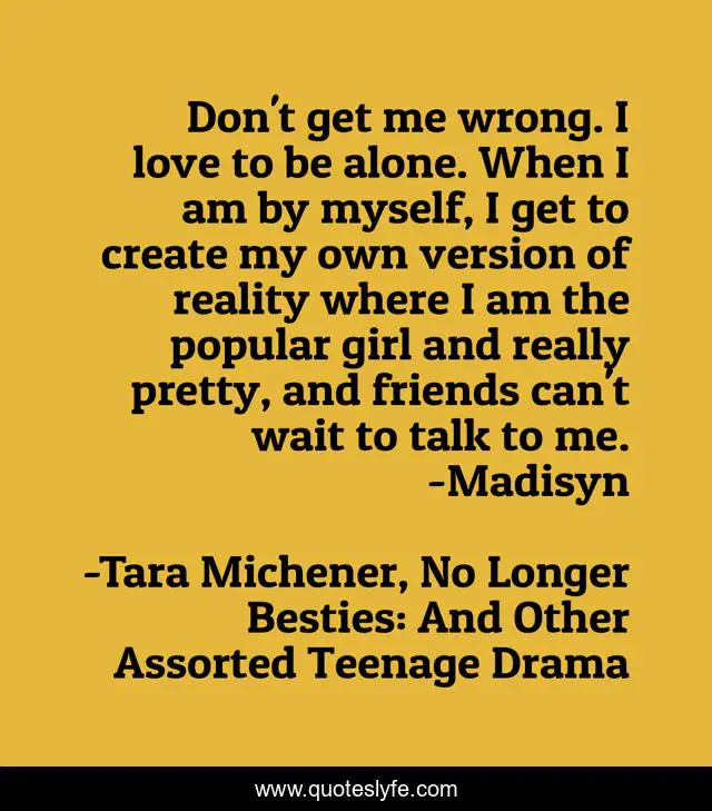 This page presents the quote "Don't get me wrong. I love to be alone. When I am by myself, I get to create my own version of reality where I am the popular girl and really pretty, and friends can't wait to talk to me. -Madisyn". Author of this quote is Tara Michener, No Longer Besties: And Other Assorted Teenage Drama. This quote is about bullying, young-adult-fiction, relational-aggression, cyberbullying, tara-michener,.