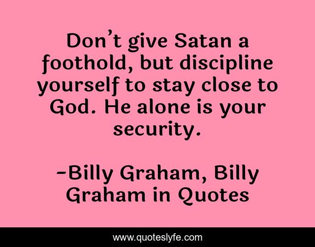 This page presents the quote "Don’t give Satan a foothold, but discipline yourself to stay close to God. He alone is your security.". Author of this quote is Billy Graham, Billy Graham in Quotes. This quote is about devil, satan, billy-graham,.