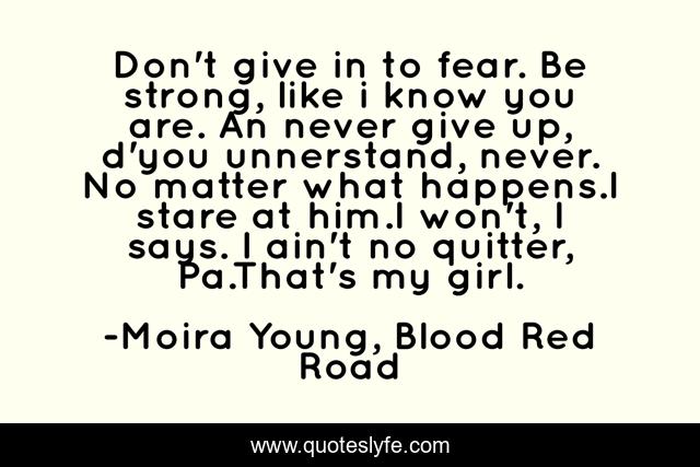 This page presents the quote "Don't give in to fear. Be strong, like i know you are. An never give up, d'you unnerstand, never. No matter what happens.I stare at him.I won't, I says. I ain't no quitter, Pa.That's my girl.". Author of this quote is Moira Young, Blood Red Road. This quote is about beautiful, enthusiasm, blood-red-road, inspirational, moira-young,.