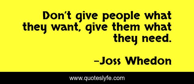 This page presents the quote "Don’t give people what they want, give them what they need.". Author of this quote is Joss Whedon. This quote is about wish-fulfillment, needs, virtue, writing,.