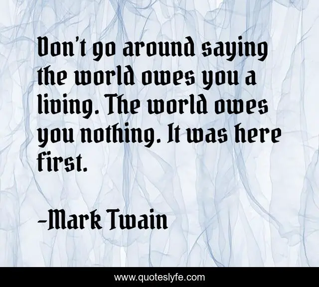 This page presents the quote "Don’t go around saying the world owes you a living. The world owes you nothing. It was here first.". Author of this quote is Mark Twain. This quote is about living, world,.