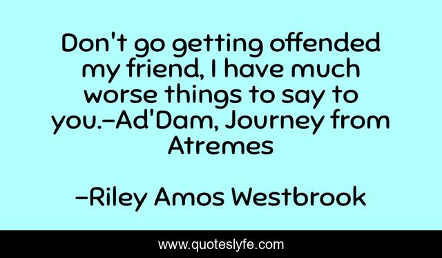 This page presents the quote "Don't go getting offended my friend, I have much worse things to say to you.-Ad'Dam, Journey from Atremes". Author of this quote is Riley Amos Westbrook. This quote is about annunaki, humour, science-fiction, journey-from-atremes, space-opera, riley-amos-westbrook,.