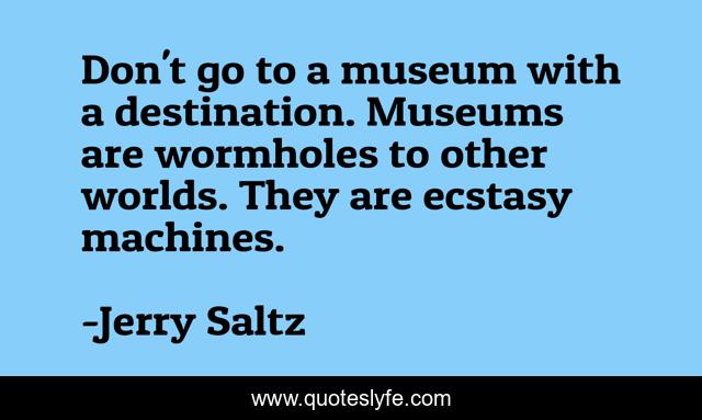 This page presents the quote "Don't go to a museum with a destination. Museums are wormholes to other worlds. They are ecstasy machines.". Author of this quote is Jerry Saltz. This quote is about museums, art,.