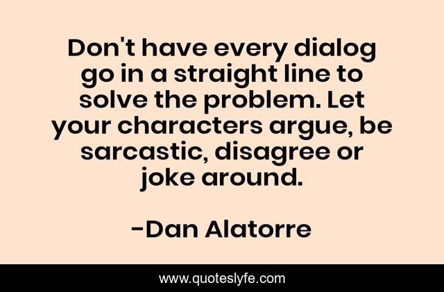 This page presents the quote "Don't have every dialog go in a straight line to solve the problem. Let your characters argue, be sarcastic, disagree or joke around.". Author of this quote is Dan Alatorre. .