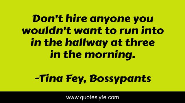 This page presents the quote "Don't hire anyone you wouldn't want to run into in the hallway at three in the morning.". Author of this quote is Tina Fey, Bossypants. This quote is about hire, work, boss, hiring, job, bosses, annoying-people,.