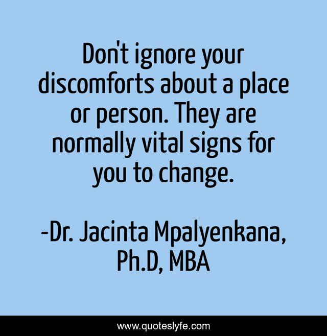This page presents the quote "Don't ignore your discomforts about a place or person. They are normally vital signs for you to change.". Author of this quote is Dr. Jacinta Mpalyenkana, Ph.D, MBA. This quote is about courage-in-life, fear, change-your-life, change-management-training,.