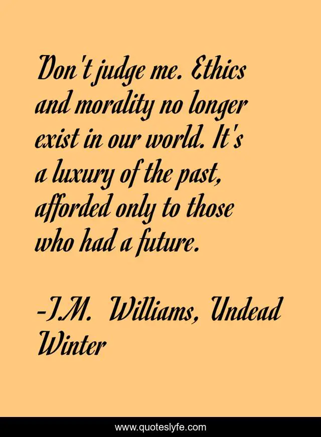 This page presents the quote "Don't judge me. Ethics and morality no longer exist in our world. It's a luxury of the past, afforded only to those who had a future.". Author of this quote is T.M. Williams, Undead Winter. This quote is about undead, death, winter, desperation, zombie, luxury, undead-winter, tm-williams, ethics,.