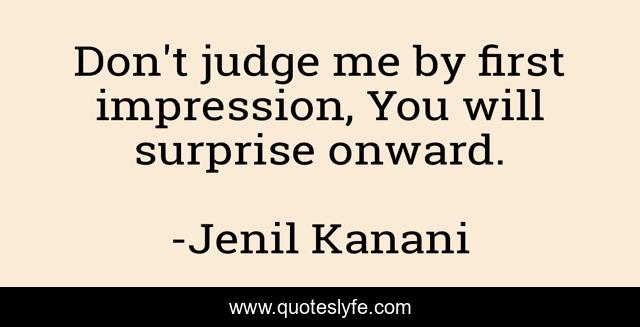 This page presents the quote "Don't judge me by first impression, You will surprise onward.". Author of this quote is Jenil Kanani. This quote is about judge, impression, attitude, behaviour, jenil,.