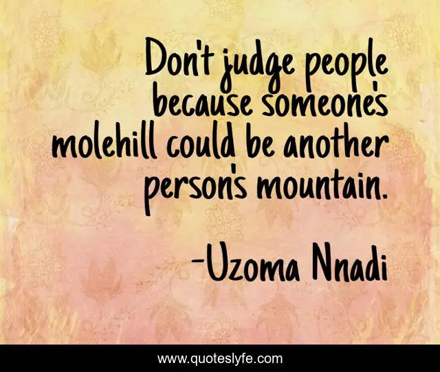 This page presents the quote "Don't judge people because someone's molehill could be another person's mountain.". Author of this quote is Uzoma Nnadi. This quote is about judge, molehill, mountain, people,.