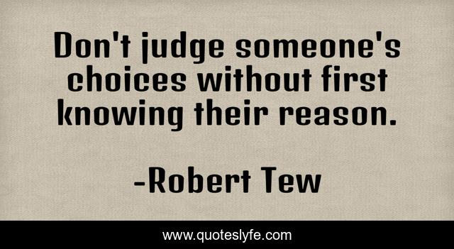 This page presents the quote "Don't judge someone's choices without first knowing their reason.". Author of this quote is Robert Tew. This quote is about judge, judgment, choices,.