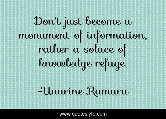 This page presents the quote "Don't just become a monument of information, rather a solace of knowledge refuge.". Author of this quote is Unarine Ramaru. This quote is about mentorship, leadership, knowledge, learning, wisdom,.