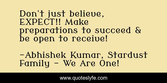 "Abhishek Kumar, Stardust Family - We Are One! Quotes." Quoteslyfe.com, 2025. Sat. 06 Dec. 2025. <https://www.quoteslyfe.com/quote/Don-t-just-believe-EXPECT-Make-preparations-160200>.