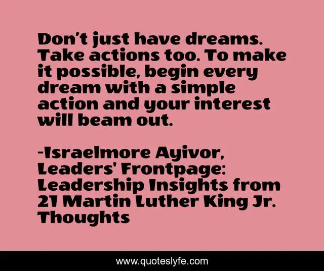 "Israelmore Ayivor, Leaders' Frontpage: Leadership Insights from 21 Martin Luther King Jr. Thoughts Quotes." Quoteslyfe.com, 2025. Tue. 30 Dec. 2025. <https://www.quoteslyfe.com/quote/Don-t-just-have-dreams-Take-actions-53552>.
