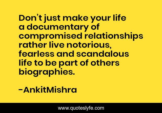 This page presents the quote "Don’t just make your life a documentary of compromised relationships rather live notorious, fearless and scandalous life to be part of others biographies.". Author of this quote is AnkitMishra. This quote is about relationships, life, love, wanderer, fearless, biography, life-philosophy, affection,.