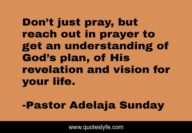 This page presents the quote "Don’t just pray, but reach out in prayer to get an understanding of God’s plan, of His revelation and vision for your life.". Author of this quote is Pastor Adelaja Sunday. This quote is about building, prayer, destiny, success, understanding,.