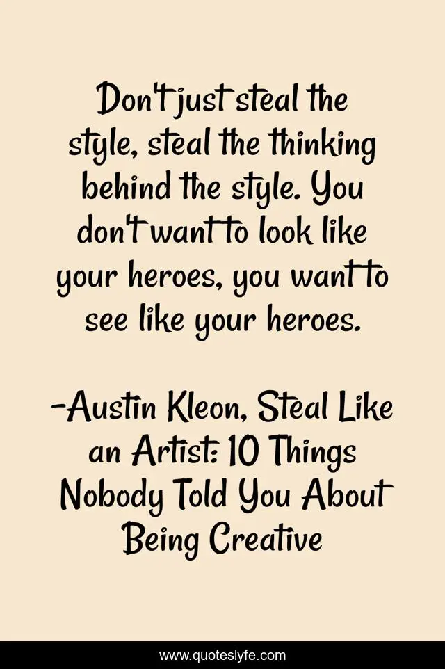 "Austin Kleon, Steal Like an Artist: 10 Things Nobody Told You About Being Creative Quotes." Quoteslyfe.com, 2025. Tue. 09 Dec. 2025. <https://www.quoteslyfe.com/quote/Don-t-just-steal-the-style-steal-250544>.