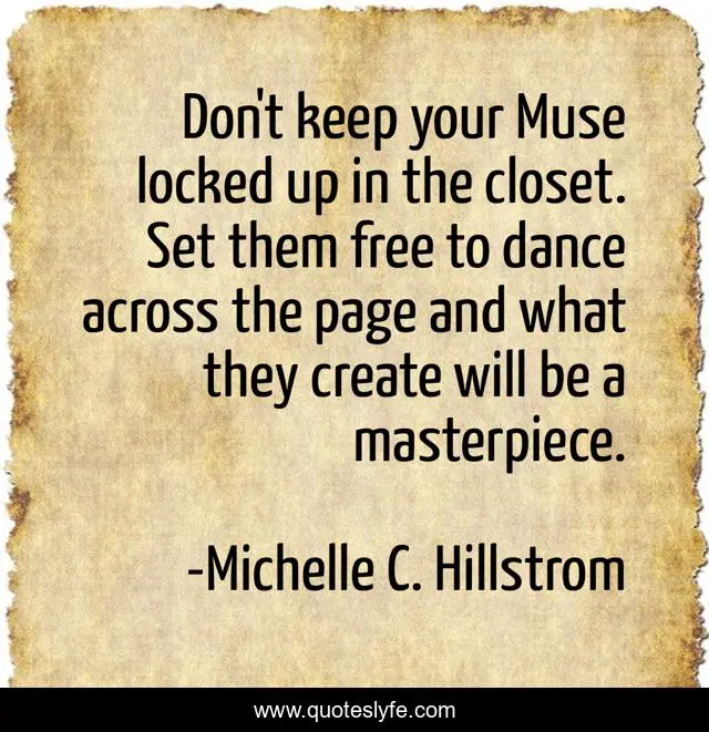 This page presents the quote "Don't keep your Muse locked up in the closet. Set them free to dance across the page and what they create will be a masterpiece.". Author of this quote is Michelle C. Hillstrom. This quote is about art, creativity, muse, writing,.