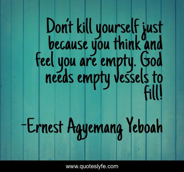 This page presents the quote "Don’t kill yourself just because you think and feel you are empty. God needs empty vessels to fill!". Author of this quote is Ernest Agyemang Yeboah. This quote is about suicide, dejected, rejected, when-things-go-wrong, emptiness, feeling-lonely, bad-mood,.