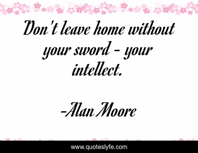 This page presents the quote "Don't leave home without your sword - your intellect.". Author of this quote is Alan Moore. This quote is about home, intellect, sword,.