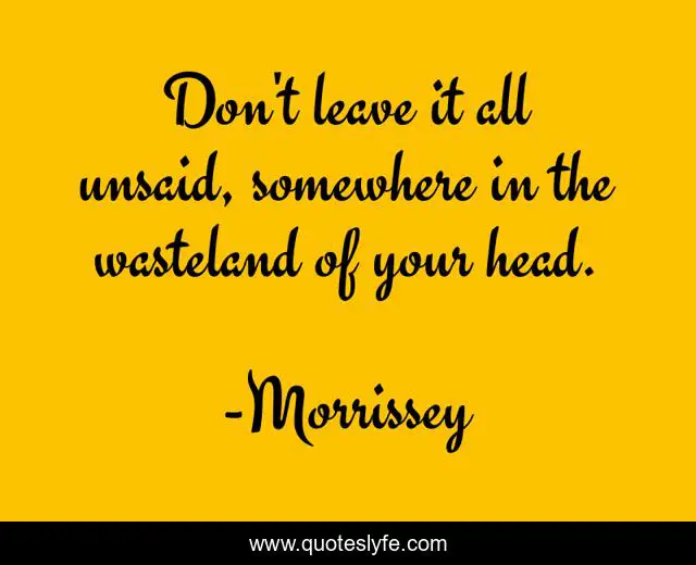 This page presents the quote "Don't leave it all unsaid, somewhere in the wasteland of your head.". Author of this quote is Morrissey. This quote is about humor, life, music, lyrics,.