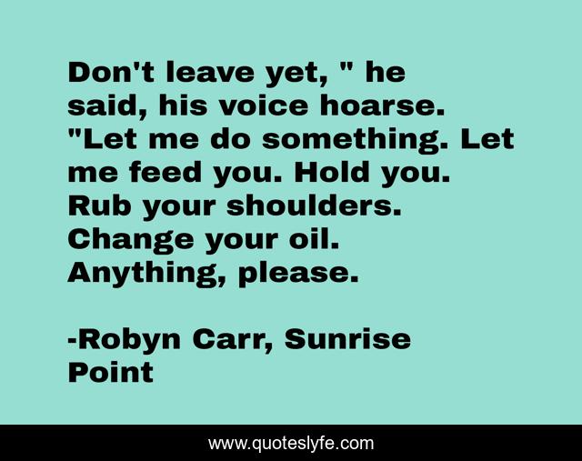 This page presents the quote "Don't leave yet, " he said, his voice hoarse. "Let me do something. Let me feed you. Hold you. Rub your shoulders. Change your oil. Anything, please.". Author of this quote is Robyn Carr, Sunrise Point. This quote is about romance, romantic, robyn-carr,.