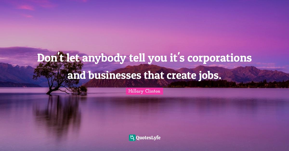 This page presents the quote "Don't let anybody tell you it's corporations and businesses that create jobs.". Author of this quote is Hillary Clinton. This quote is about corporations, jobs, economics,.